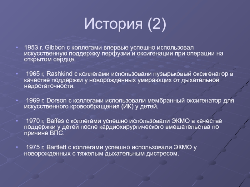 1975 г, Bartlett с коллегами успешно использовали ЭКМО у новорожденных с тяжелым дыхательным дистресом.
