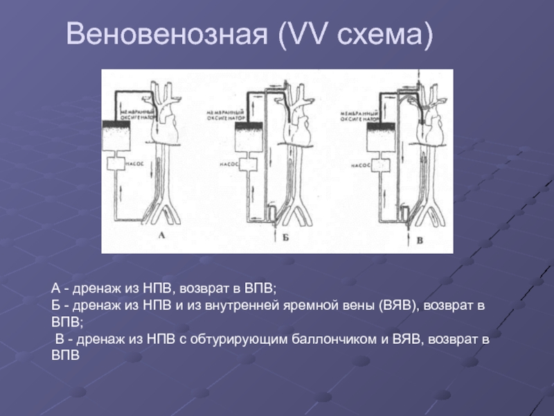 С. Вено-венозное: забор через V.Jugularis intern. dextr. из Atrium dextr.