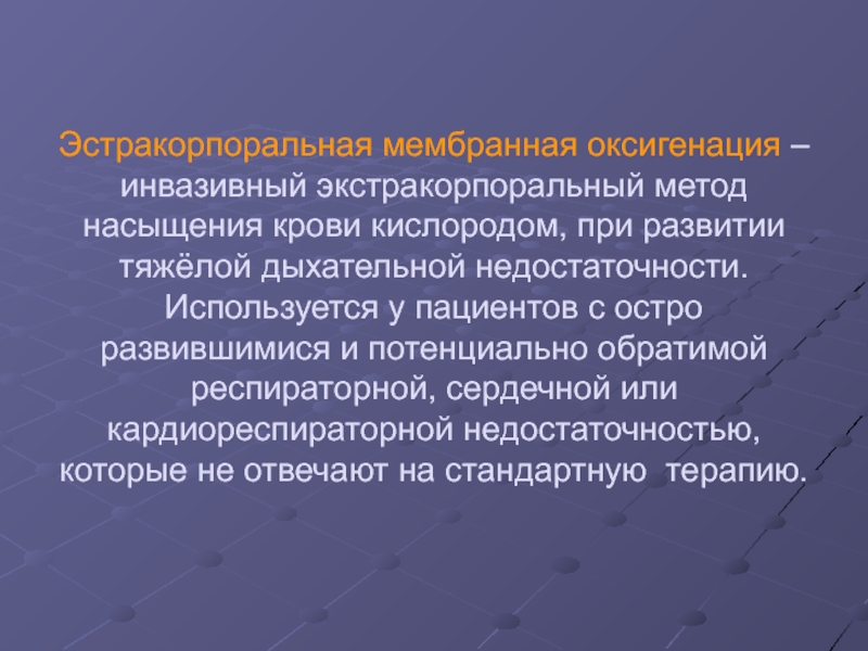 Слайд 2Эстракорпоральная мембранная оксигенация – инвазивный экстракорпоральный метод насыщения крови кислородом,
