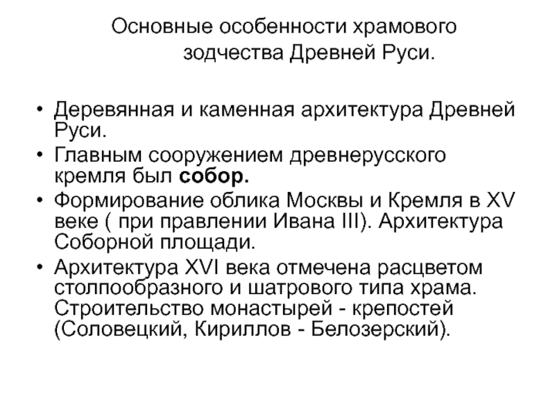Архитектура XVI века отмечена расцветом столпообразного и шатрового типа храма. Строительство монастырей - крепостей (Соловецкий, Кириллов - Белозерский).