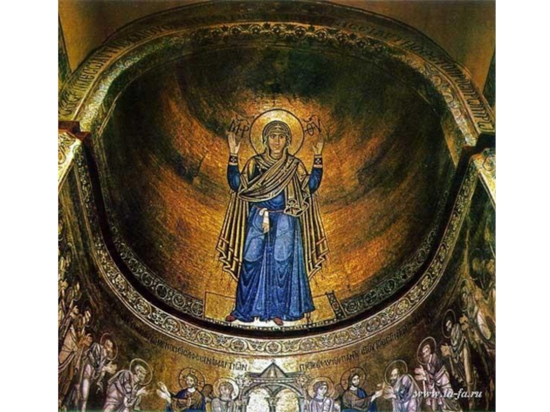 монументальная живопись (фрески, мозаики) и иконопись (византийская живопись) с уже выработанными иконографическими типами и системой символов.
