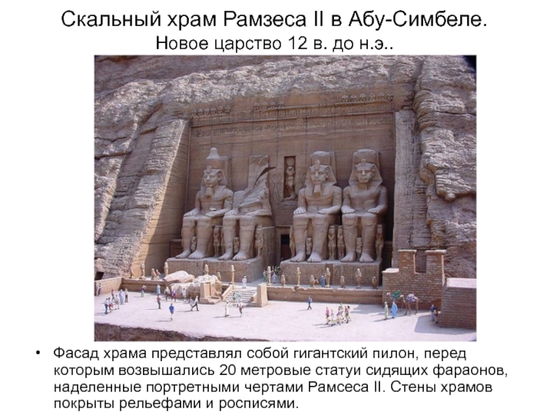 20 метровые статуи сидящих фараонов, наделенные портретными чертами Рамсеса II. Стены храмов покрыты рельефами и росписями.
