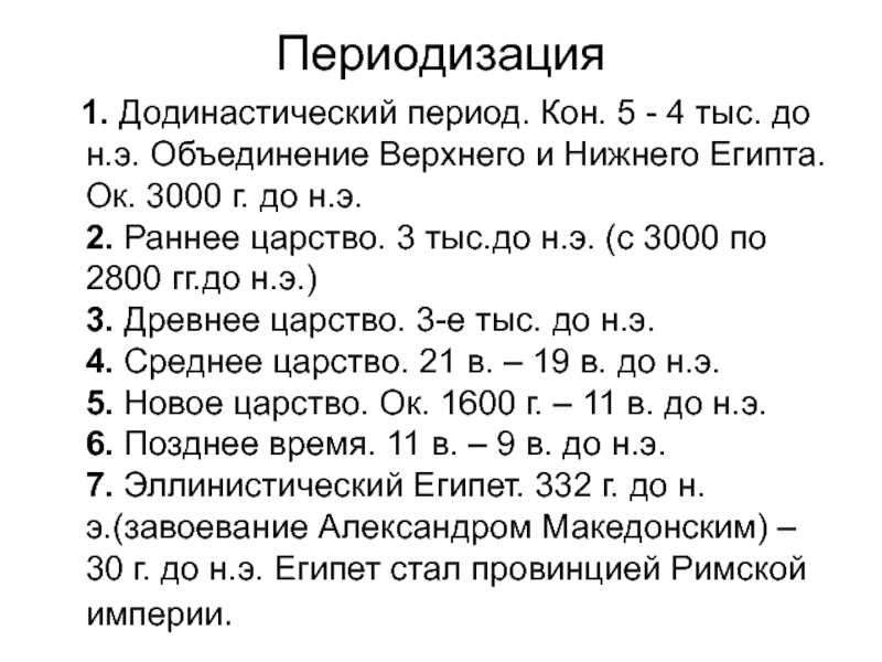 7. Эллинистический Египет. 332 г. до н.э.(завоевание Александром Македонским) – 30 г. до н.э. Египет стал провинцией Римской империи.
