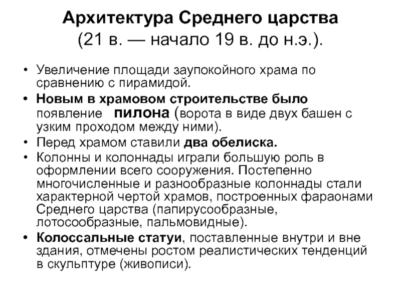 Колонны и колоннады играли большую роль в оформлении всего сооружения. Постепенно многочисленные и разнообразные колоннады стали характерной чертой храмов, построенных фараонами Среднего царства (папирусообразные, лотосообразные, пальмовидные).