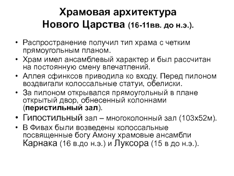 В Фивах были возведены колоссальные посвященные богу Амону храмовые ансамбли Карнака (16 в.до н.э.) и Луксора (15 в до н.э.).