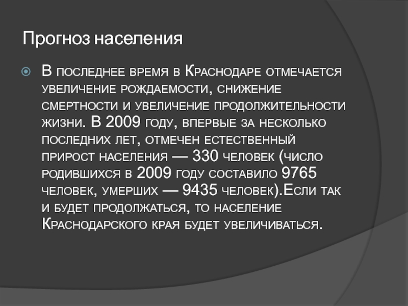 несколько последних лет, отмечен естественный прирост населения — 330 человек (число родившихся в 2009 году составило 9765 человек, умерших — 9435 человек).Если так и будет продолжаться, то население Краснодарского края будет увеличиваться.
