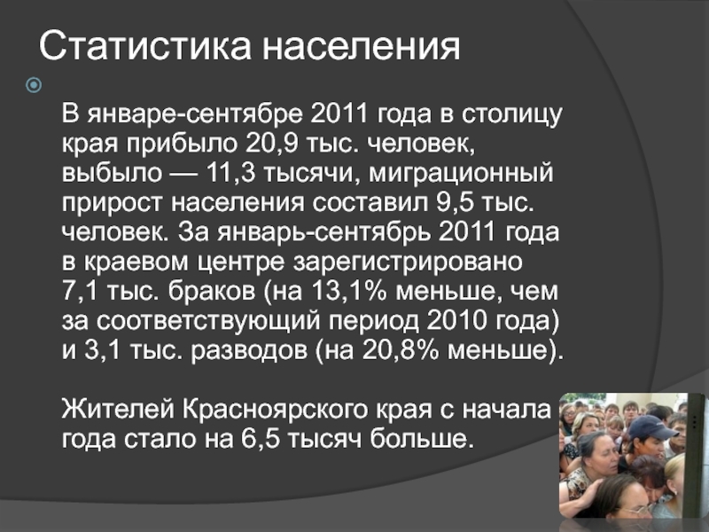 11,3 тысячи, миграционный прирост населения составил 9,5 тыс. человек. За январь-сентябрь 2011 года