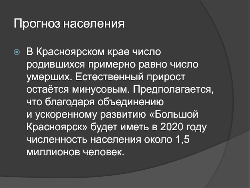 Красноярск» будет иметь в 2020 году численность населения около 1,5 миллионов человек.