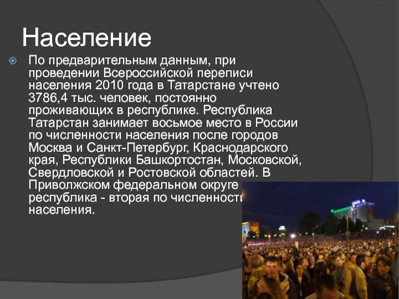 Республика Татарстан занимает восьмое место в России по численности населения после городов Москва и Санкт-Петербург, Краснодарского края, Республики Башкортостан, Московской, Свердловской и Ростовской областей. В Приволжском федеральном округе республика - вторая по численности населения.