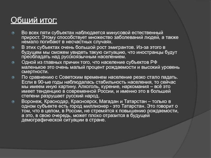Воронеж, Краснодар, Красноярск, Магадан и Татарстан – только в одном субъекте есть город миллионер - это Татарстан. Это говорит о том, что в целом, в России, не стремятся к повышению рождаемости, а это, в свою очередь, может плохо отразится в будущей демографической ситуации в стране.