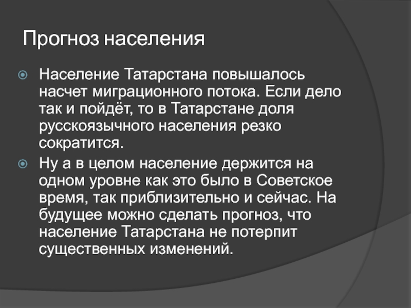 Ну а в целом население держится на одном уровне как это было в Советское время, так приблизительно и сейчас. На будущее можно сделать прогноз, что население Татарстана не потерпит существенных изменений.