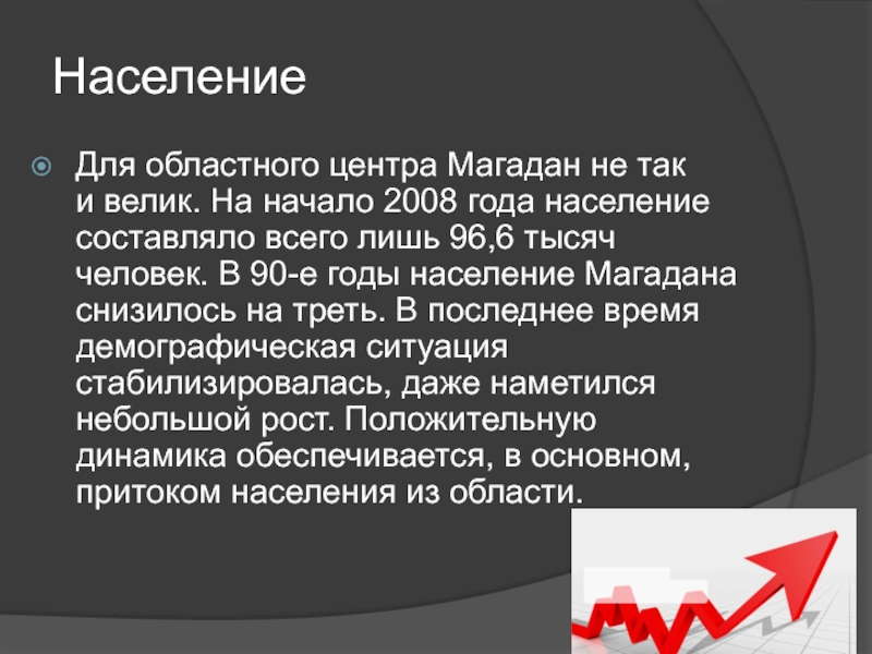 Для областного центра Магадан не так и велик. На начало 2008 года население составляло
