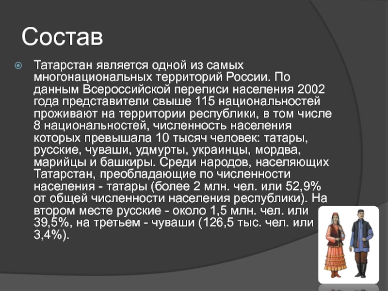 Татарстан является одной из самых многонациональных территорий России. По данным