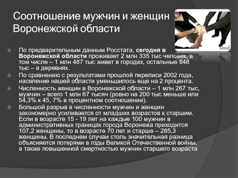 Численность женщин в Воронежской области – 1 млн 267 тыс, мужчин – всего 1 млн 67 тысяч (ровно на 200 тыс меньше или 54,3% к 45, 7% в процентном соотношении).
