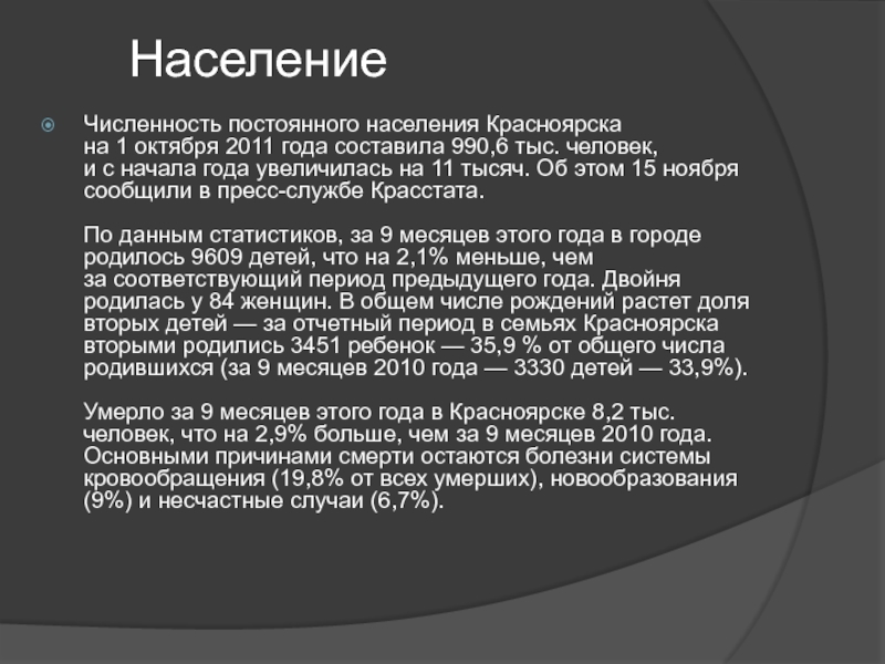 Умерло за 9 месяцев этого года в Красноярске 8,2 тыс. человек, что на 2,9% больше, чем за 9 месяцев 2010 года. Основными причинами смерти остаются болезни системы кровообращения (19,8% от всех умерших), новообразования (9%) и несчастные случаи (6,7%).