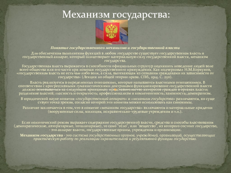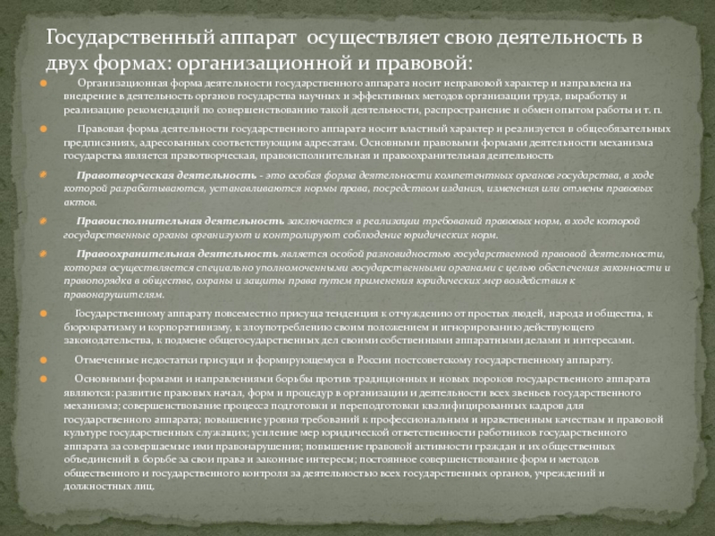 Существенные признаки исполнительной власти — это ее универсальный и предметный характер. Первый признак отражает тот факт, что исполнительная власть, ее органы действуют непрерывно и везде, на всей территории государства. Этим они отличаются и от законодательных, и от судебных органов. Другой признак означает, что исполнительная власть, также в отличие от законодательной и судебной, имеет другое содержание, поскольку опирается на людские, материальные, финансовые и иные ресурсы, использует инструмент служебных продвижений и систему поощрений. В руках исполнительной власти находится весьма грозная сила, ведь существование государственной власти находит свое выражение именно в ее чиновниках, армии, администрации, судьях. Среди этой силы особая роль принадлежит вооруженным формированиям: армии, органам безопасности, милиции (полиции).