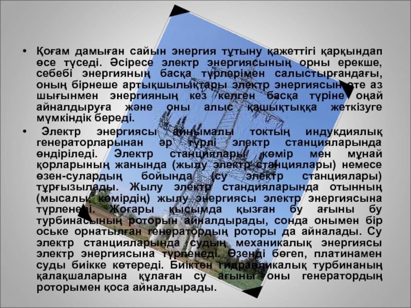 электр энергиясының орны ерекше, себебі энергияның басқа түрлерімен салыстырғандағы, оның