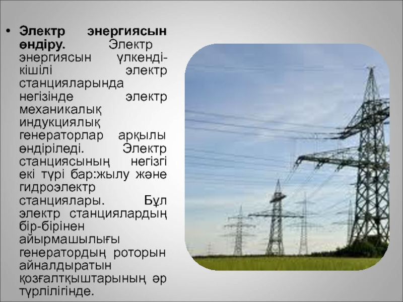 бірнеше артықшылықтары электр энергиясын өте аз шығынмен энергияның кез келген басқа түріне оңай айналдыруға және оны алыс қашықтыққа жеткізуге мүмкіндік береді.Электр энергиясы айнымалы токтың индукдиялық генераторларынан әр түрлі электр станцияларында өндіріледі. Электр станциялары көмір мен мұнай қорларының жанында (жылу электр станциялары) немесе өзен-сулардың бойында (су электр станциялары) тұрғызылады. Жылу электр стандияларында отынның (мысалы, көмірдің) жылу энергиясы электр энергиясына түрленеді. Жоғары қысымда қызған бу ағыны бу турбинасының роторын айналдырады, сонда онымен бір оське орнатылған генератордың роторы да айналады. Су электр станцияларында судың механикалық энергиясы электр энергиясына түрленеді. Өзенді бөгеп, платинамен суды биікке көтереді. Биіктен гидравликалық турбинаның қалақшаларына құлаған су ағыны оны генератордың роторымен қоса айналдырады.
