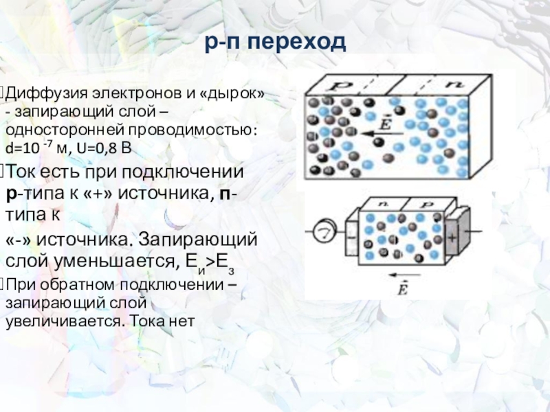Диффузия электронов и «дырок» - запирающий слой –односторонней проводимостью: