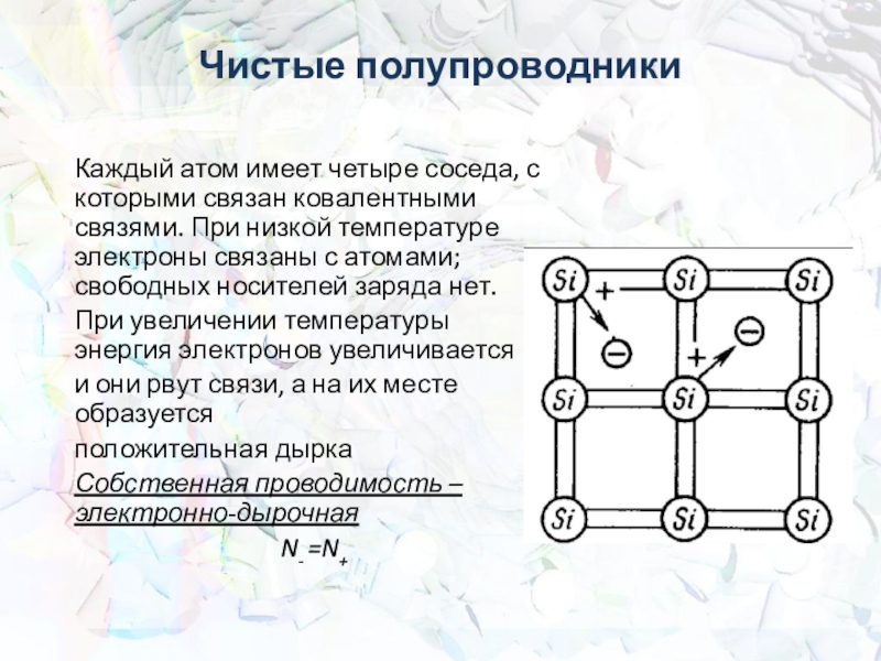 связями. При низкой температуре электроны связаны с атомами; свободных носителей