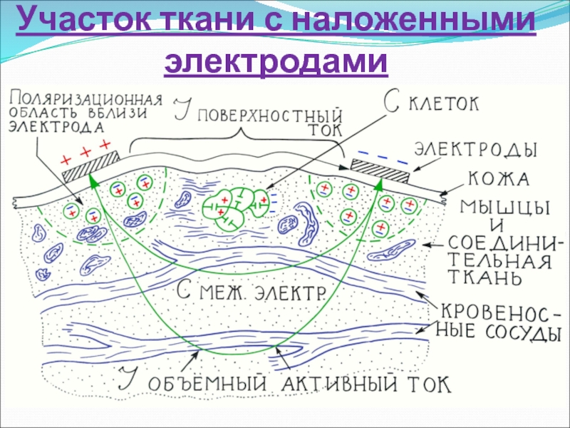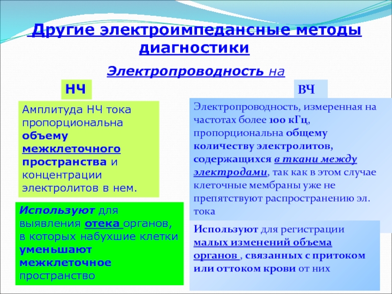 Электропроводность, измеренная на частотах более 100 кГц, пропорциональна общему количеству электролитов, содержащихся в ткани между электродами, так как в этом случае клеточные мембраны уже не препятствуют распространению эл. тока