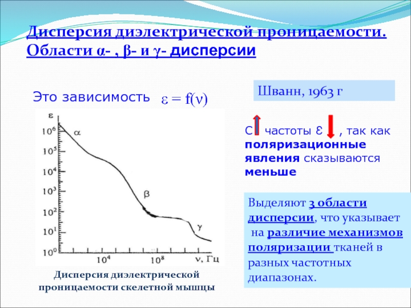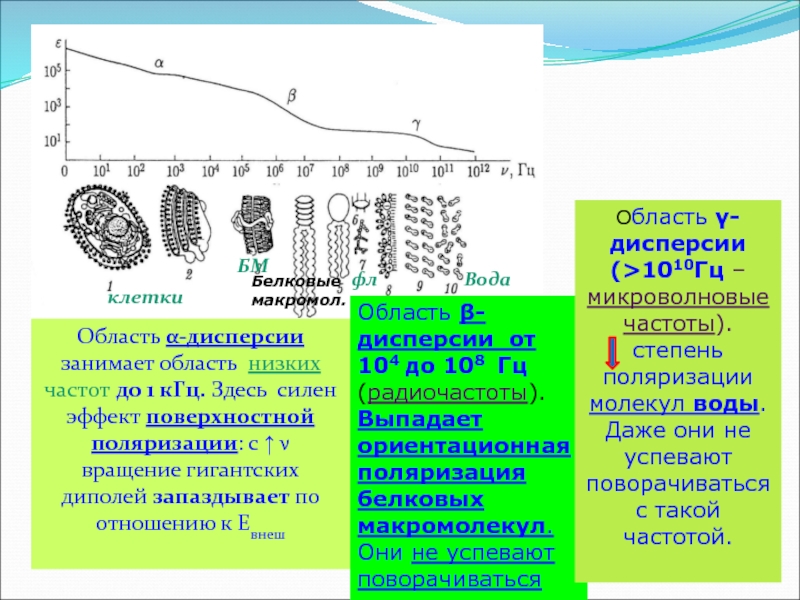 Область γ-дисперсии (>1010Гц –микроволновые частоты). степень поляризации молекул воды. Даже они не успевают поворачиваться с такой частотой.