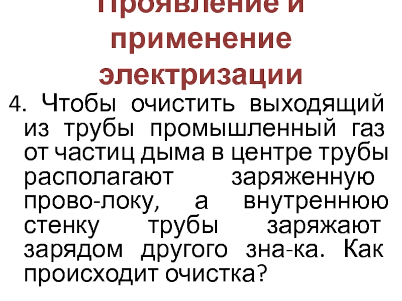 Проявление и применение электризации4. Чтобы очистить выходящий из трубы промышленный газ от частиц дыма в центре трубы