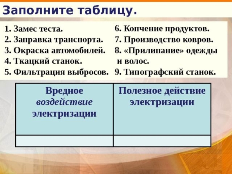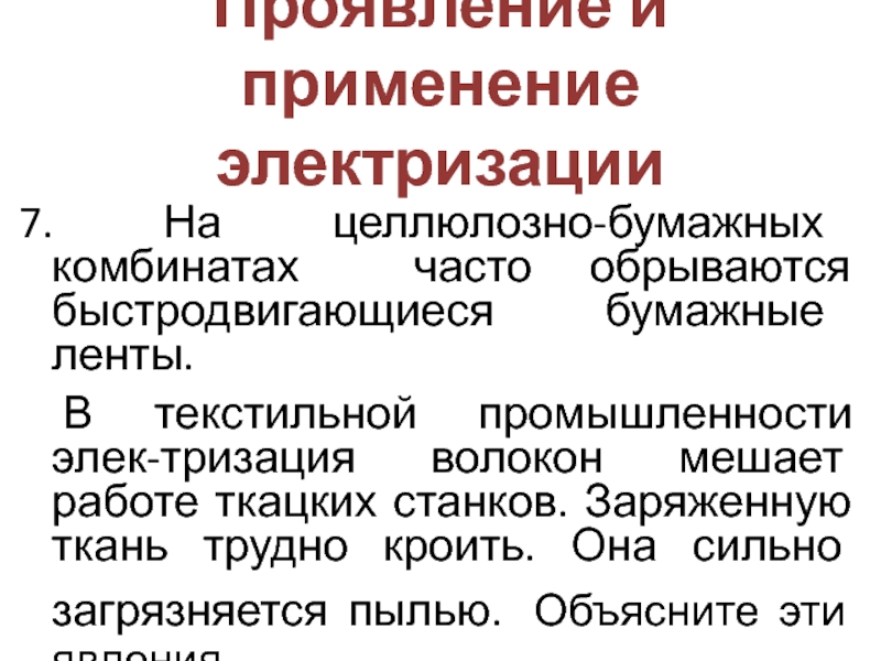 Проявление и применение электризации7. На целлюлозно-бумажных комбинатах часто обрываются быстродвигающиеся бумажные ленты. 	В текстильной промышленности элек-тризация волокон