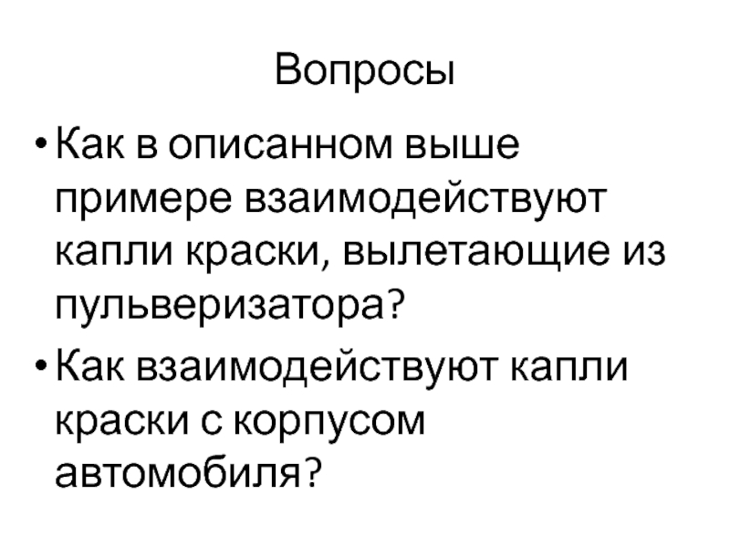 Вопросы Как в описанном выше примере взаимодействуют капли краски, вылетающие из пульверизатора?Как взаимодействуют капли краски с корпусом