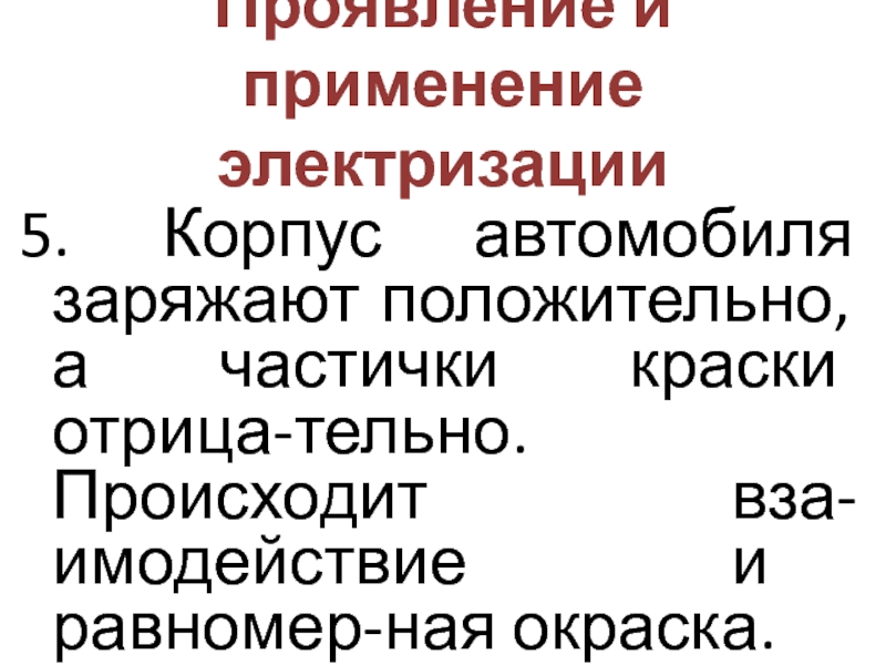 Проявление и применение электризации5. Корпус автомобиля заряжают положительно, а частички краски отрица-тельно. Происходит вза-имодействие и равномер-ная окраска.