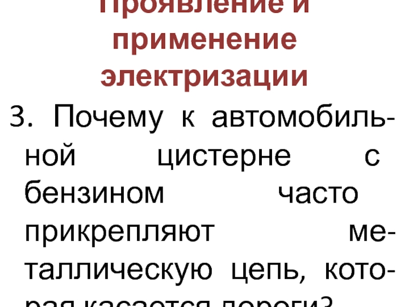 Проявление и применение электризации3. Почему к автомобиль-ной  цистерне с бензином часто прикрепляют ме-таллическую цепь, кото-рая касается дороги?
