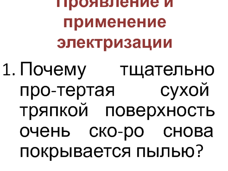 Проявление и применение электризацииПочему тщательно про-тертая сухой тряпкой поверхность очень ско-ро снова покрывается пылью?