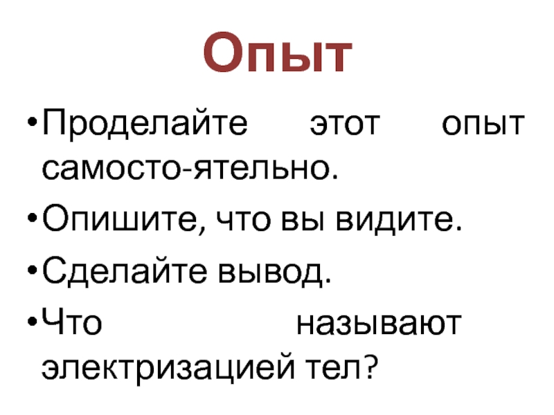 ОпытПроделайте этот опыт самосто-ятельно.Опишите, что вы видите.Сделайте вывод.Что называют электризацией тел?
