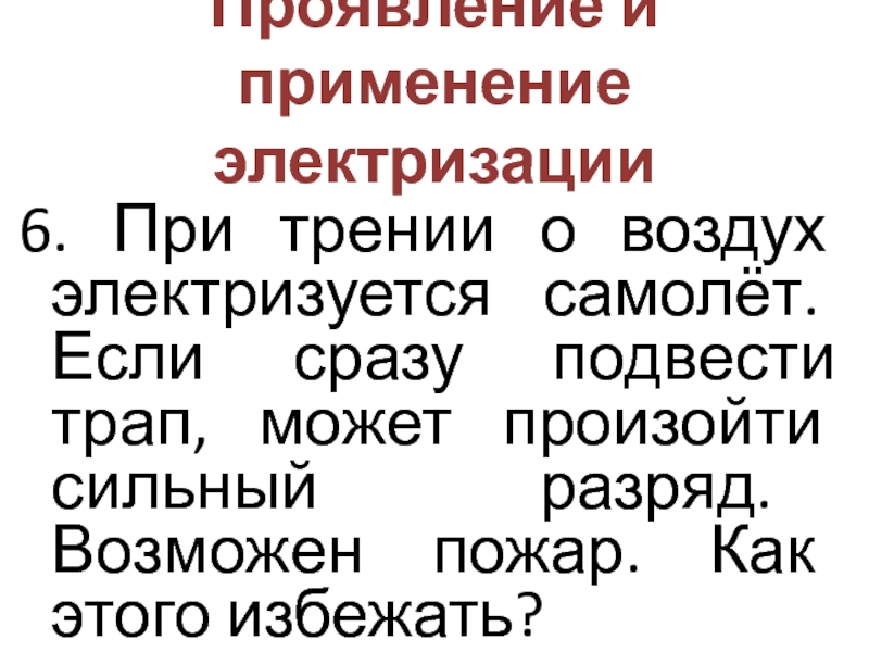 Проявление и применение электризации6. При трении о воздух электризуется самолёт. Если сразу подвести трап, может произойти сильный