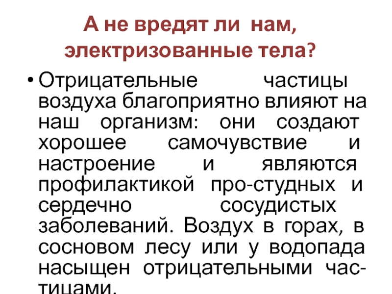 А не вредят ли нам, электризованные тела? Отрицательные частицы воздуха благоприятно влияют на наш организм: они создают