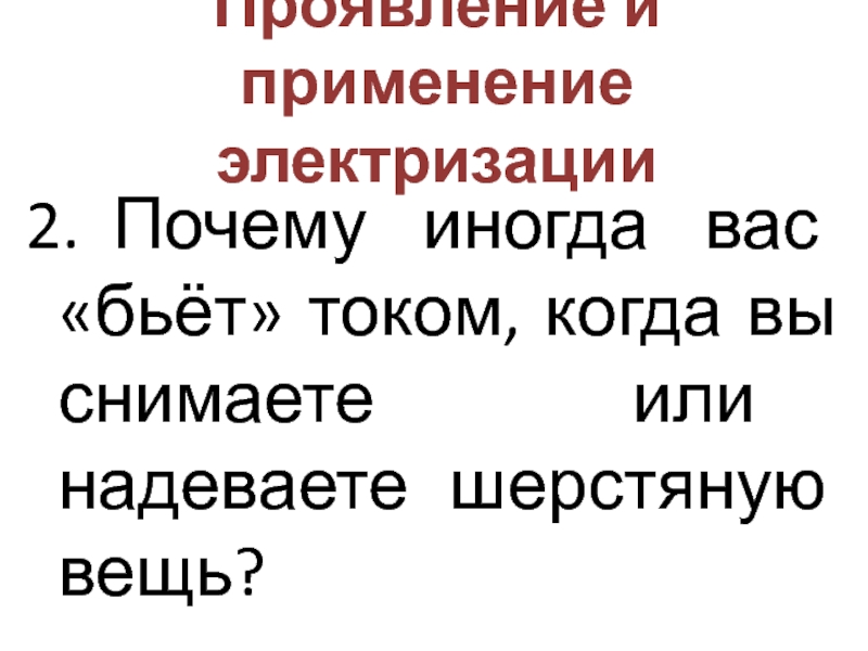 Проявление и применение электризации2.	Почему иногда вас «бьёт» током, когда вы снимаете или надеваете шерстяную вещь?