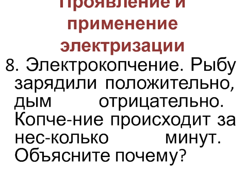 Проявление и применение электризации8. Электрокопчение. Рыбу зарядили положительно, дым отрицательно. Копче-ние происходит за нес-колько минут. Объясните почему?