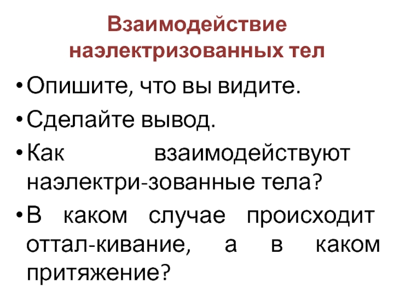 Взаимодействие  наэлектризованных телОпишите, что вы видите.Сделайте вывод.Как взаимодействуют наэлектри-зованные тела?В каком случае происходит оттал-кивание, а в