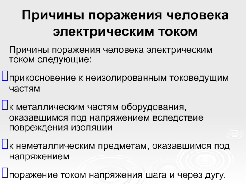 Слайд 12Причины поражения человека электрическим током