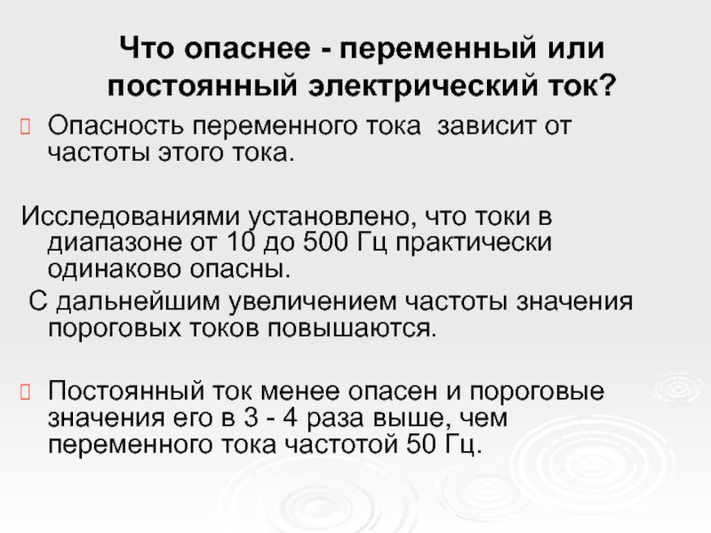 Постоянный ток менее опасен и пороговые значения его в 3 - 4 раза выше, чем переменного тока частотой 50 Гц.