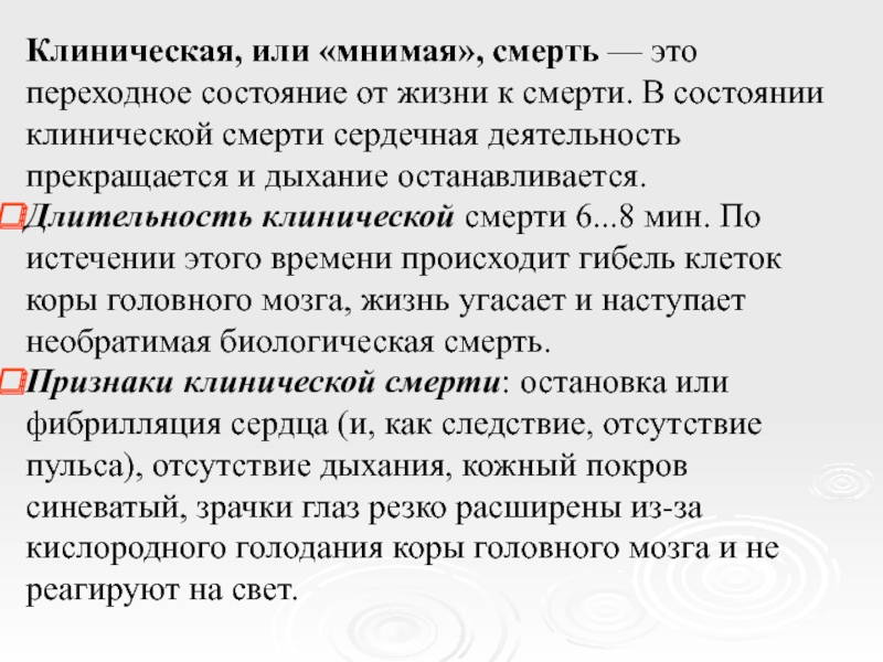 Слайд 17Клиническая, или «мнимая», смерть — это переходное состояние от жизни