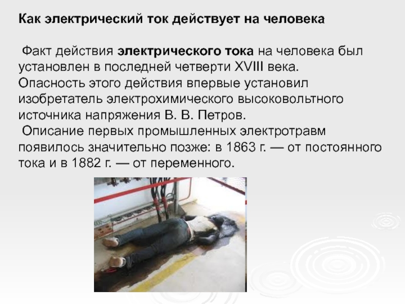 Описание первых промышленных электротравм появилось значительно позже: в 1863 г. — от постоянного тока и в 1882 г. — от переменного.