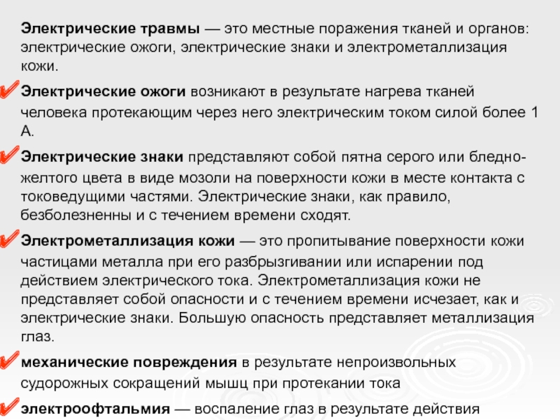 Слайд 14Электрические травмы — это местные поражения тканей и органов: электрические