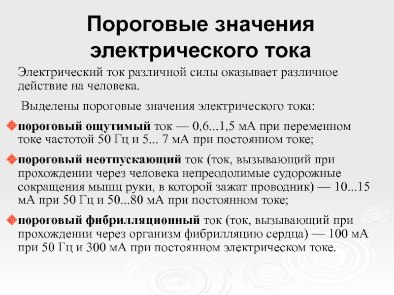 Слайд 19Пороговые значения электрического тока