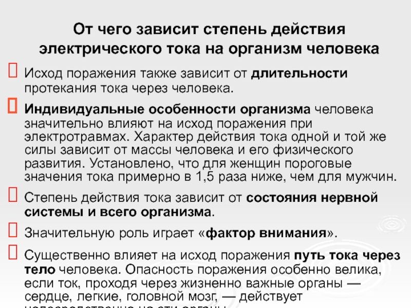 Слайд 20От чего зависит степень действия электрического тока на организм человека