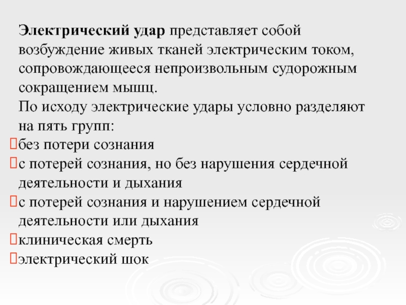 Слайд 16Электрический удар представляет собой возбуждение живых тканей электрическим током, сопровождающееся