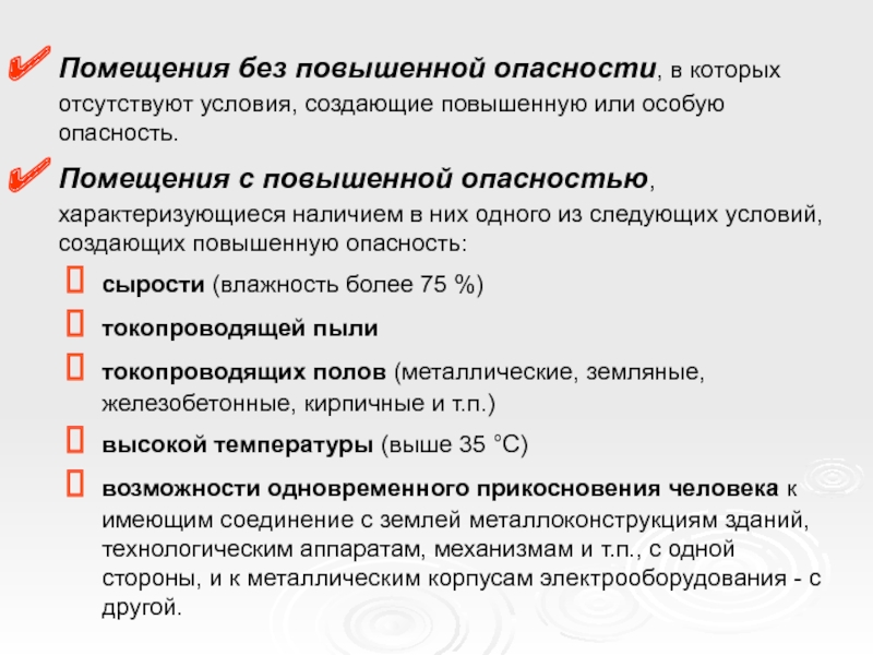 Слайд 6Помещения без повышенной опасности, в которых отсутствуют условия, создающие повышенную