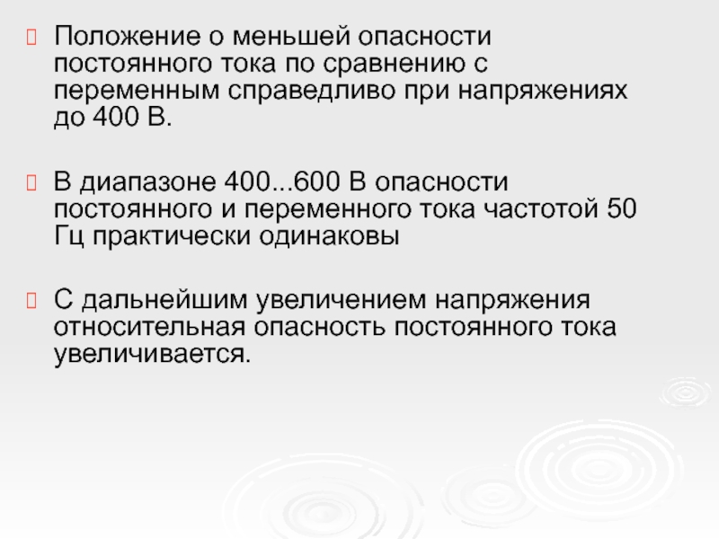 Слайд 22Положение о меньшей опасности постоянного тока по сравнению с переменным