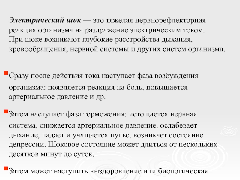 Слайд 18Электрический шок — это тяжелая нервнорефлекторная реакция организма на раздражение