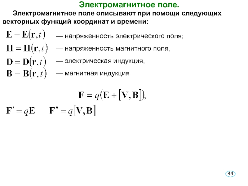 ЭМП в вакууме характеризуется вектором напряжённости электрического поля Е и магнитной индукцией В, которые определяют силы, действующие со стороны поля на неподвижные и движущиеся заряженные частицы.